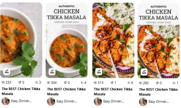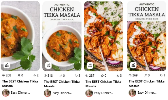 For both the Chicken Tikka Masala and Lemon Bars posts, pins with no text overlay often performed just as well as—or occasionally better than—those with text.